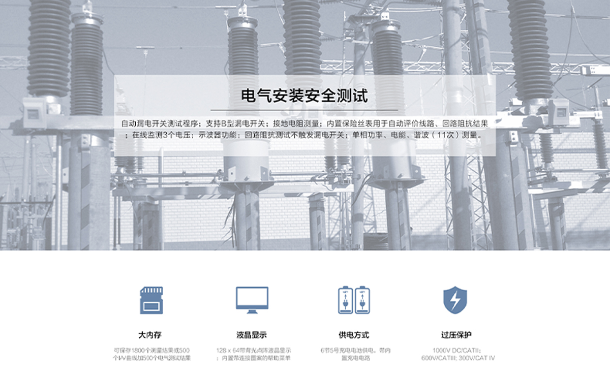 絕緣電阻;PE導(dǎo)線連續(xù)性;線路阻抗;回路阻抗(不觸發(fā)漏電開關(guān));RCD漏電開關(guān)測試(AC、A、B型);接地電阻測試;交流電流測試(負載電流或泄漏電流);電壓、頻率、相序測試;功率、電能、諧波測試。